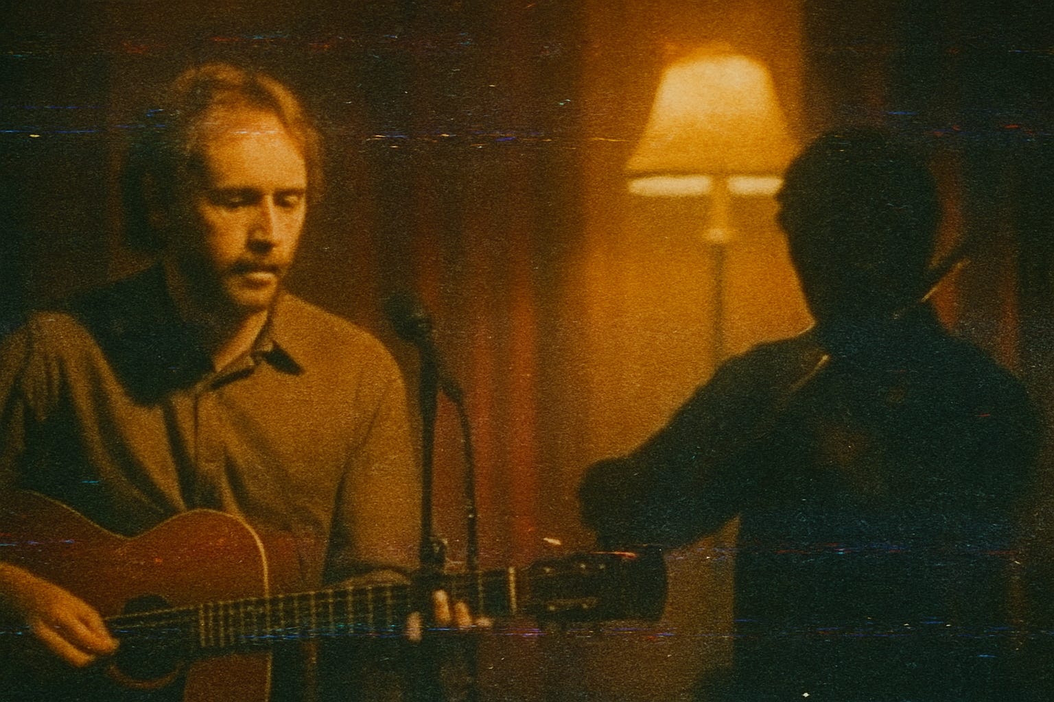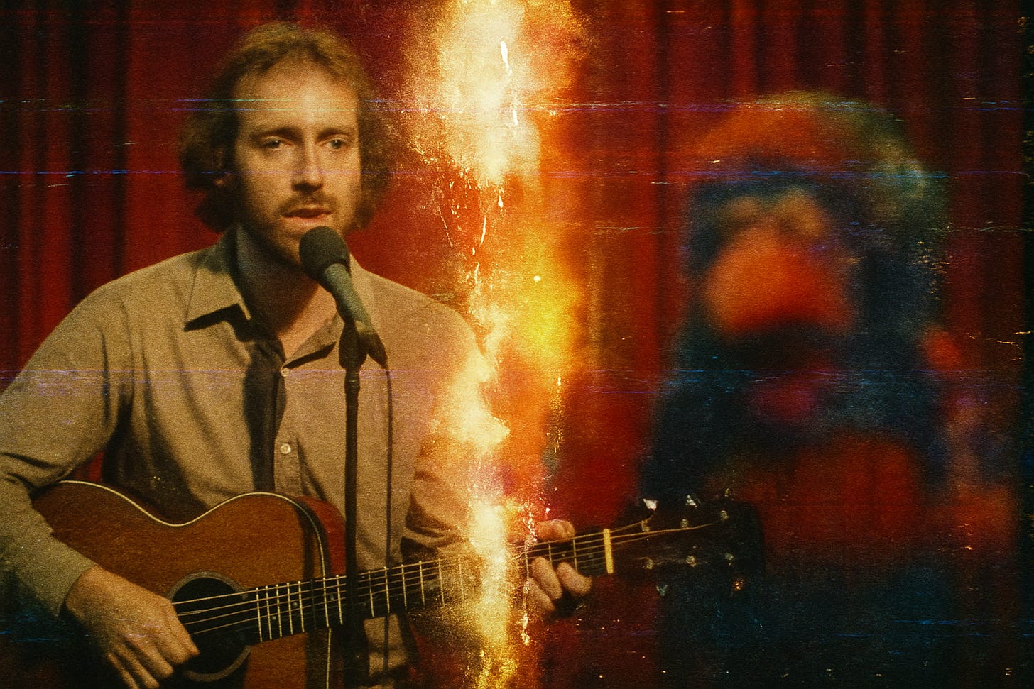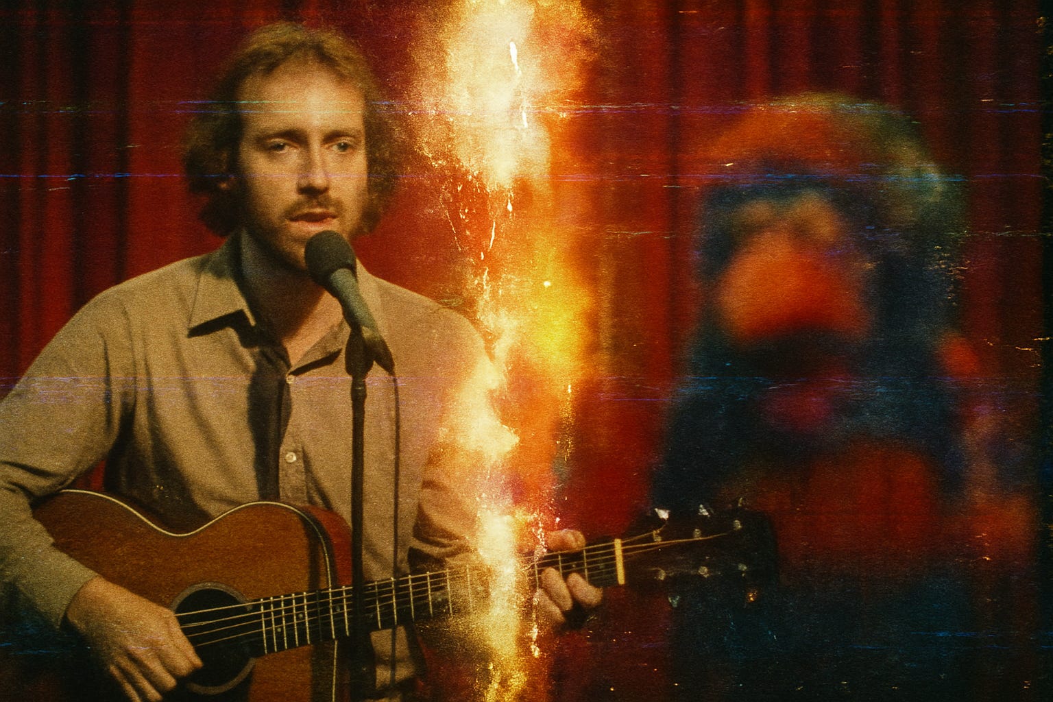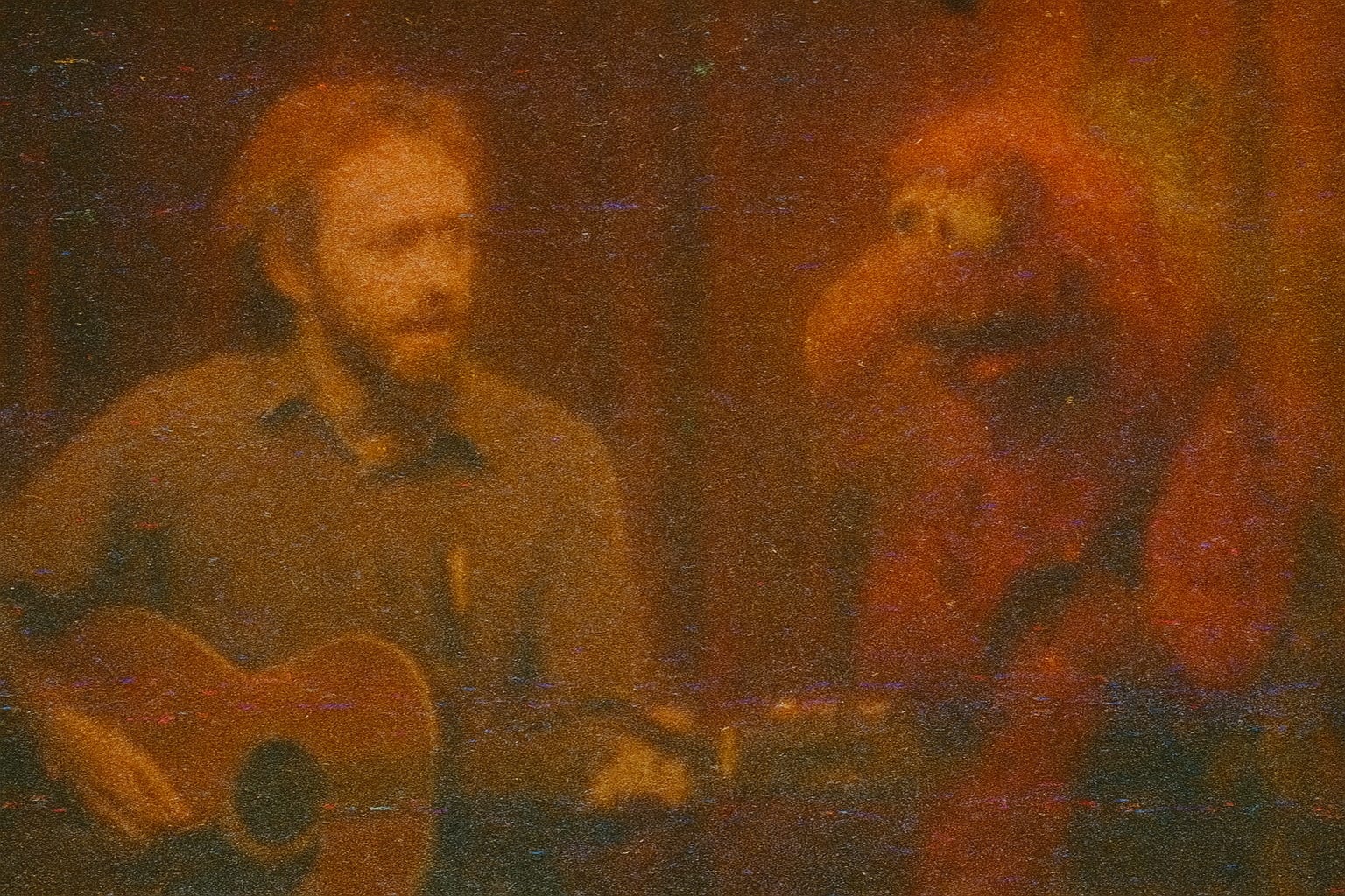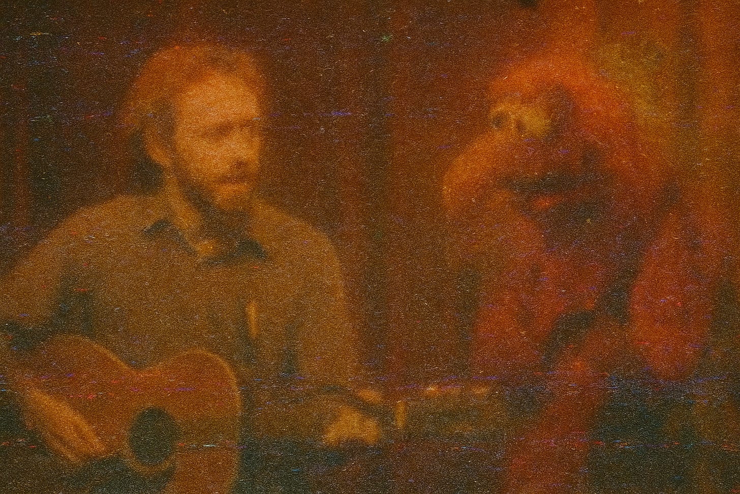 A tall, nervous fellow (SPACE CHIMP) sidles into frame with a scuffed acoustic guitar. He waves like a man trying not to disturb a beehive.