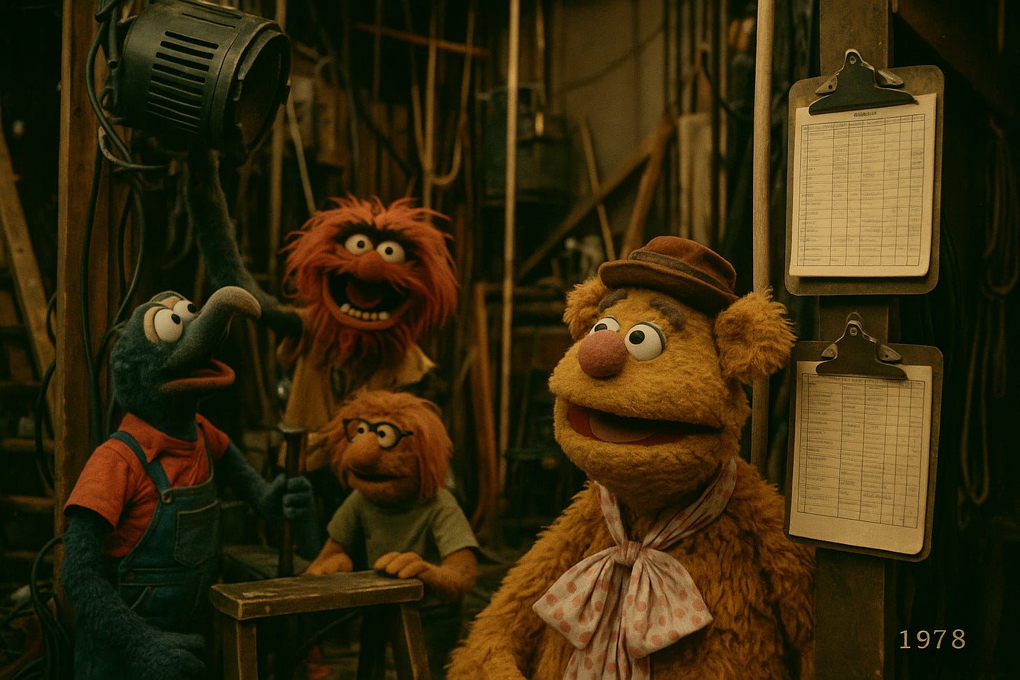 The stage of The Muppet Show. Velvet curtains, warm tungsten spill. The house band punctuates a jaunty sting.